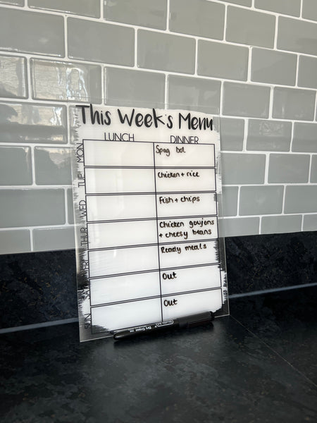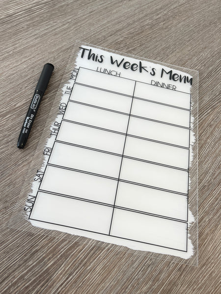 PREMIUM QUALITYMade from high-quality 2-3mm acrylic, this meal planner is durable, easy to clean, and resistant to wear and tear. Its clear, smooth surface ensures that your writing is crisp and legible, while the included drywipe pen lets you easily update your meals as needed.